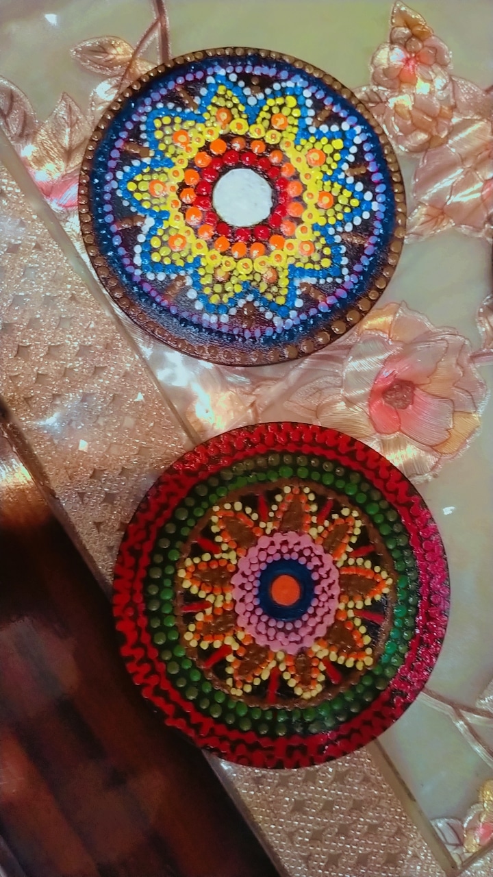 Bring color, positivity, and artistry to your space with this handcrafted set of five mandala dot-painted coasters. Each coaster is carefully painted using premium acrylic paints and sealed with a protective glossy varnish to ensure long-lasting shine and durability.